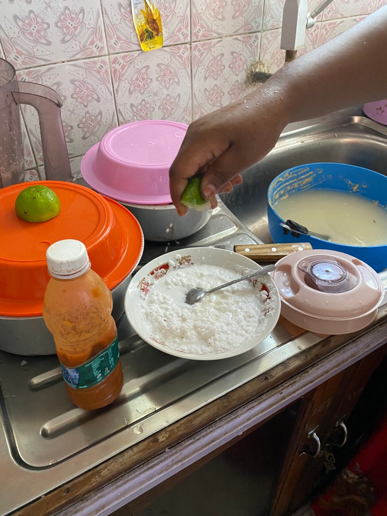 We then separated it into two bowls– milk with and without ‘meat’– the milk would later be used in EVERY main dish, while the pulpy meat was used to make a dipping sauce or chutney.
