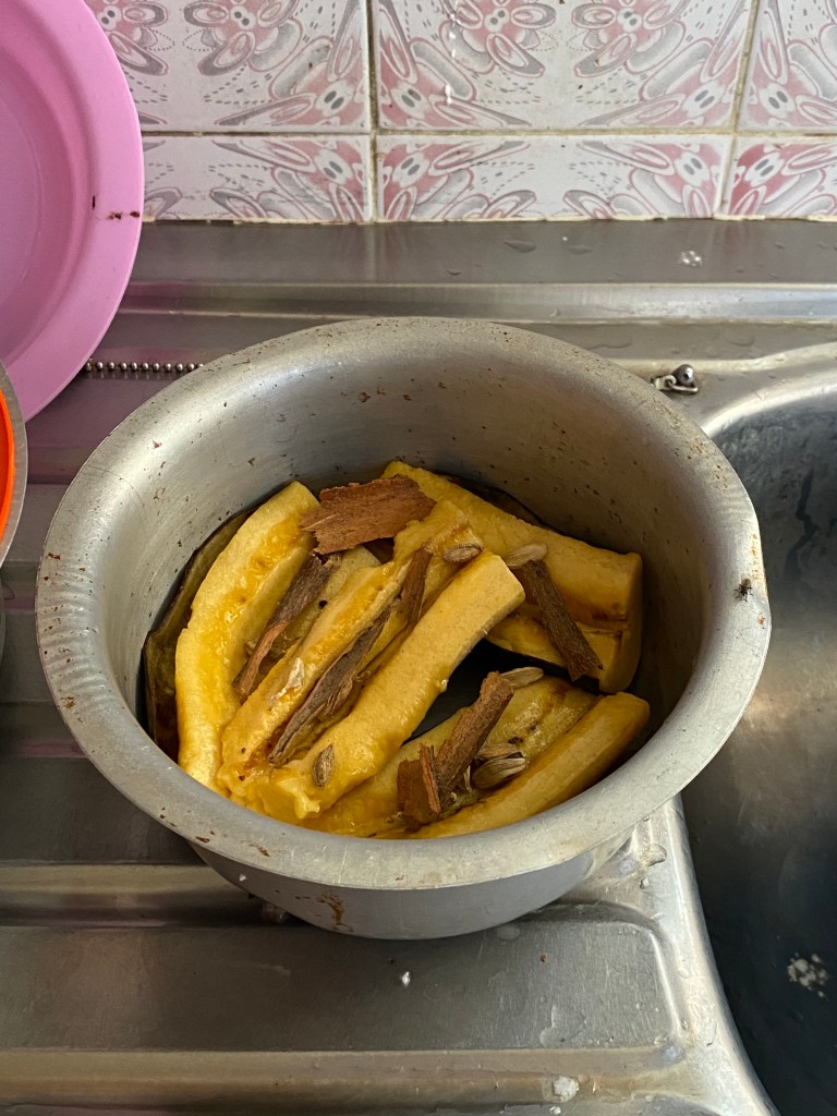 For the ndizi, soak the plantains, then cut them in half in both directions, into large pieces. Add coconut milk, whole cardamom pod, and cinnamon bark. Put on the fire until soft– and enjoy! (Would be great with ice cream)